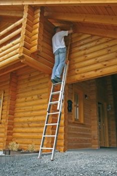 - Приставная лестница, выполнена из алюминия. Имеет перекладины специально для работы на большой высоте.