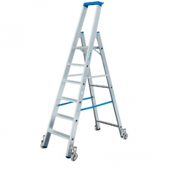 Передвижная лестница из алюминия односторонняя, имеет 4 самоблокирующимися роликами диаметром 80 мм, имеет автоматику „Roll/Stop“